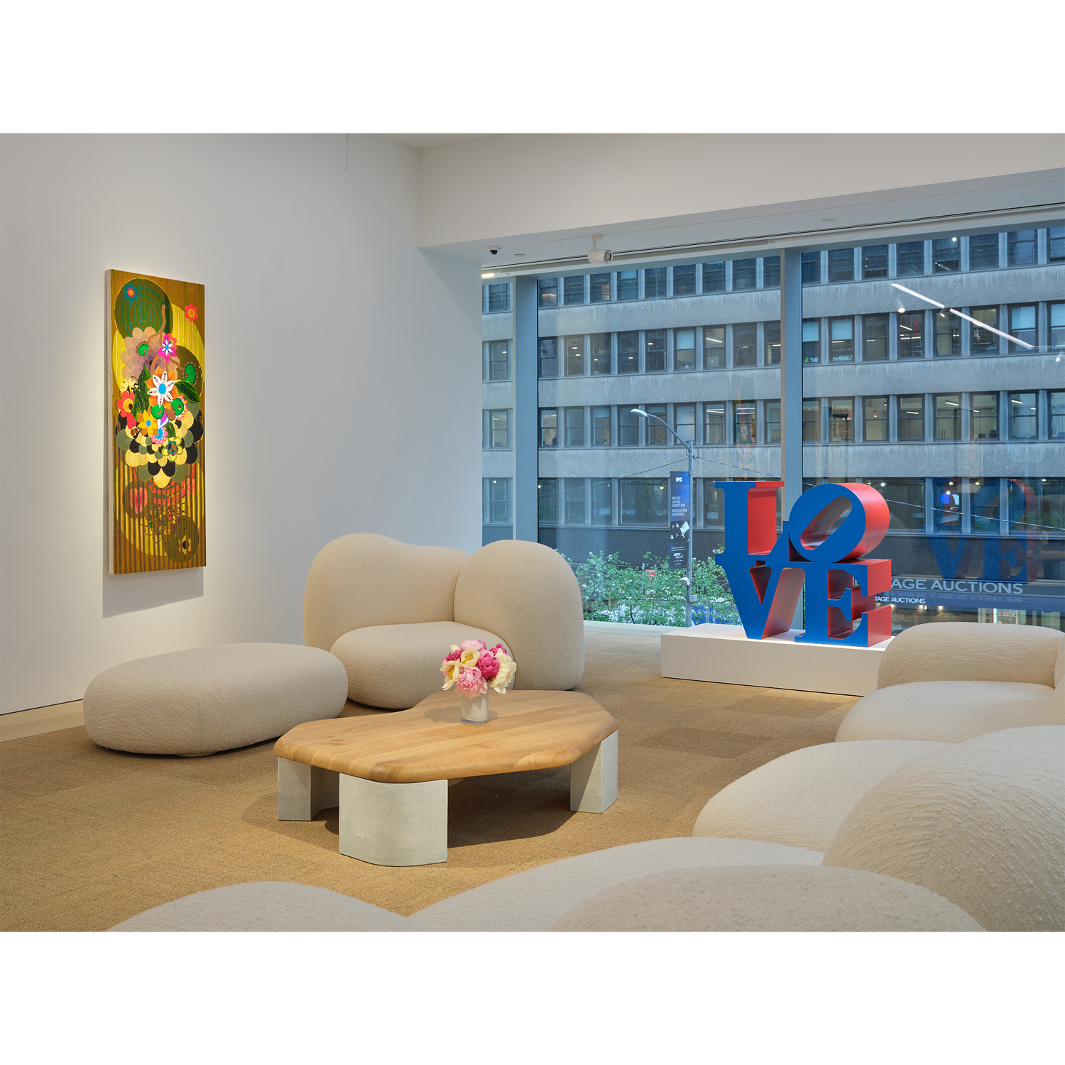 Picturing Beatriz Milhazes, Salcinha I, 2001 and Robert Indiana, LOVE (Blue Faces Red Sides), 1966 with Lagoon Modular Sofa by Körner Interiors and Gray Coffee Table by Jacques Doucet. Furniture of courtesy Invisible Collection.