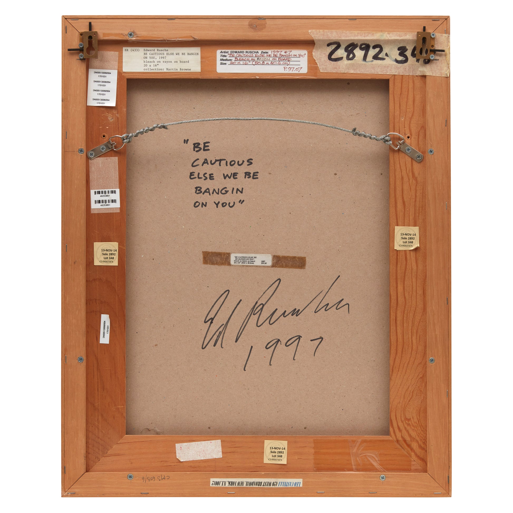 signed, titled and dated ‘‘Be Cautious Else We Be Bangin on You’ Ed Ruscha 1997’ on the backing board