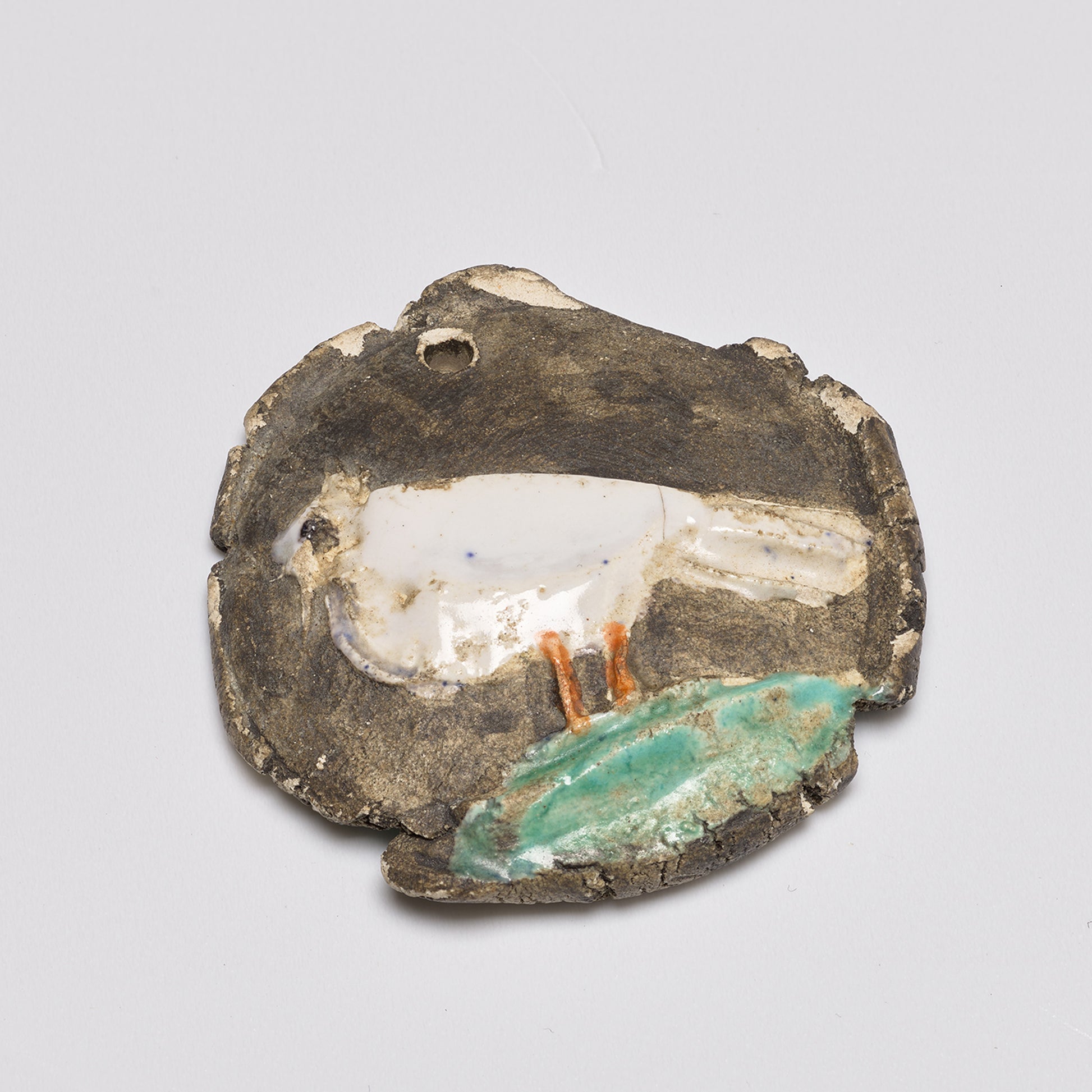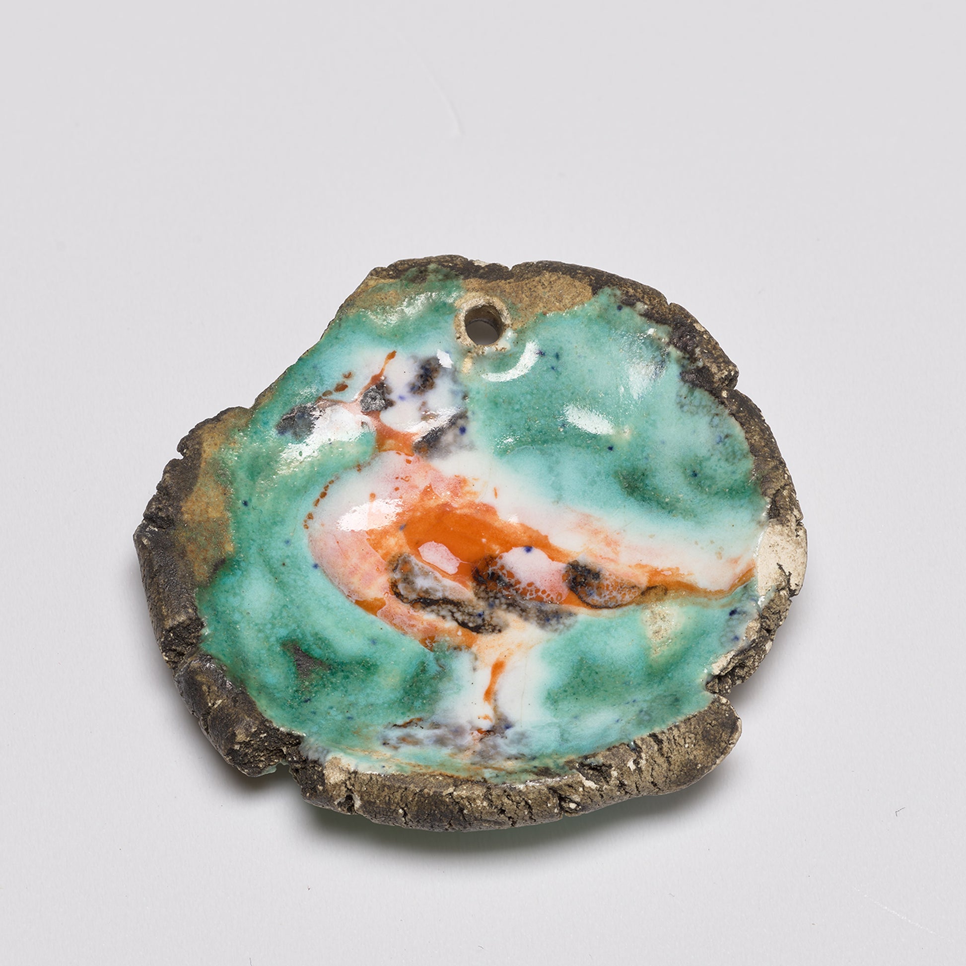 white earthenware pendant painted, glazed and decorated with metallic oxides