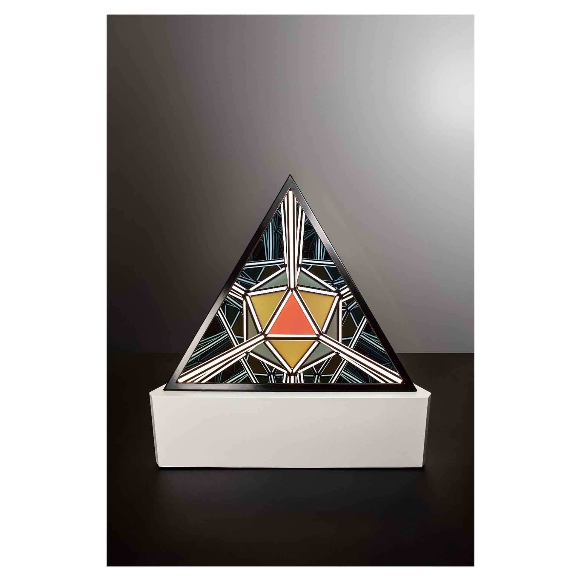 Reflective glass, mirror, powder coated steel, aluminium, acrylic, iridescent film, LED lighting and painted plinth