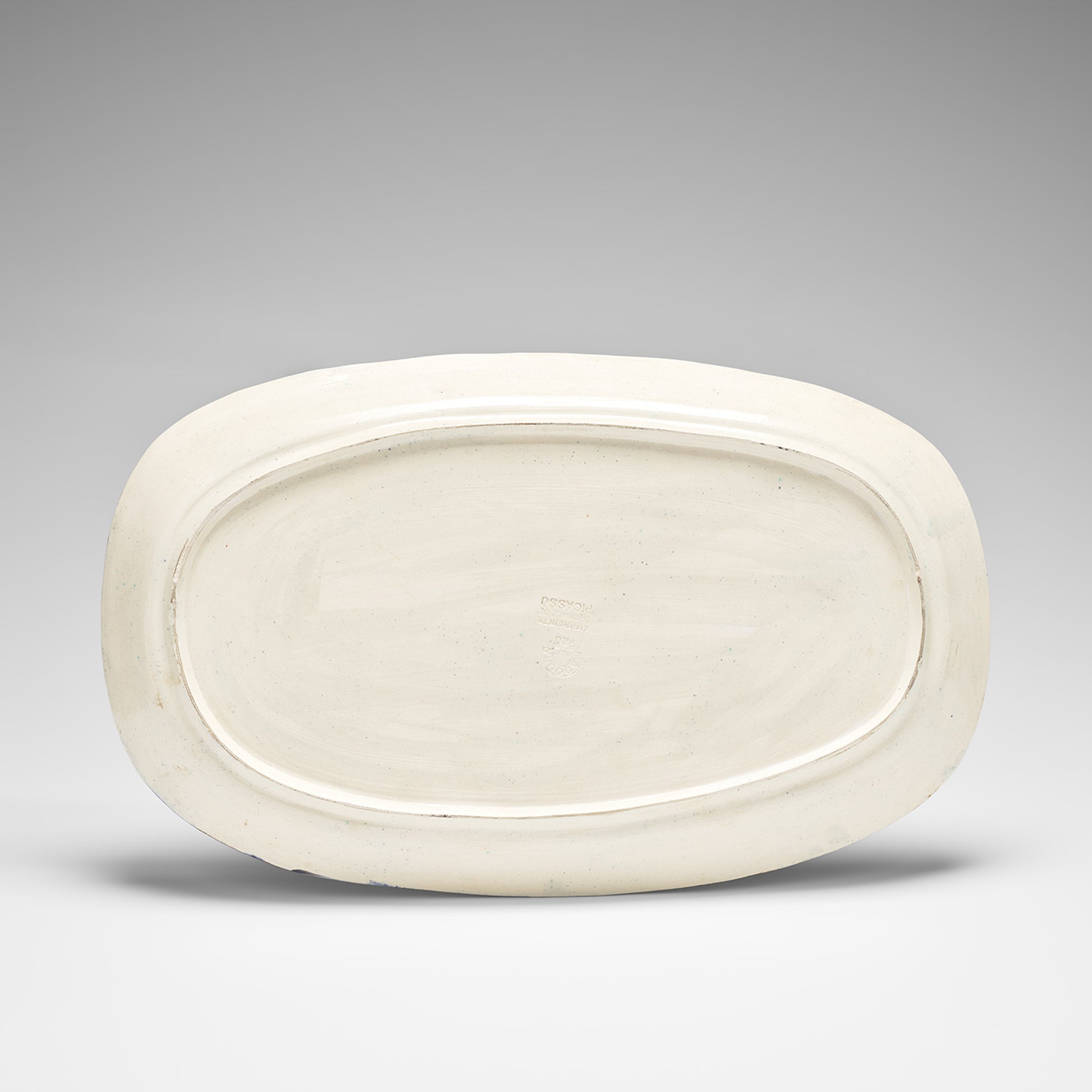 white earthenware oblong dish painted in colours with partial brushed glaze